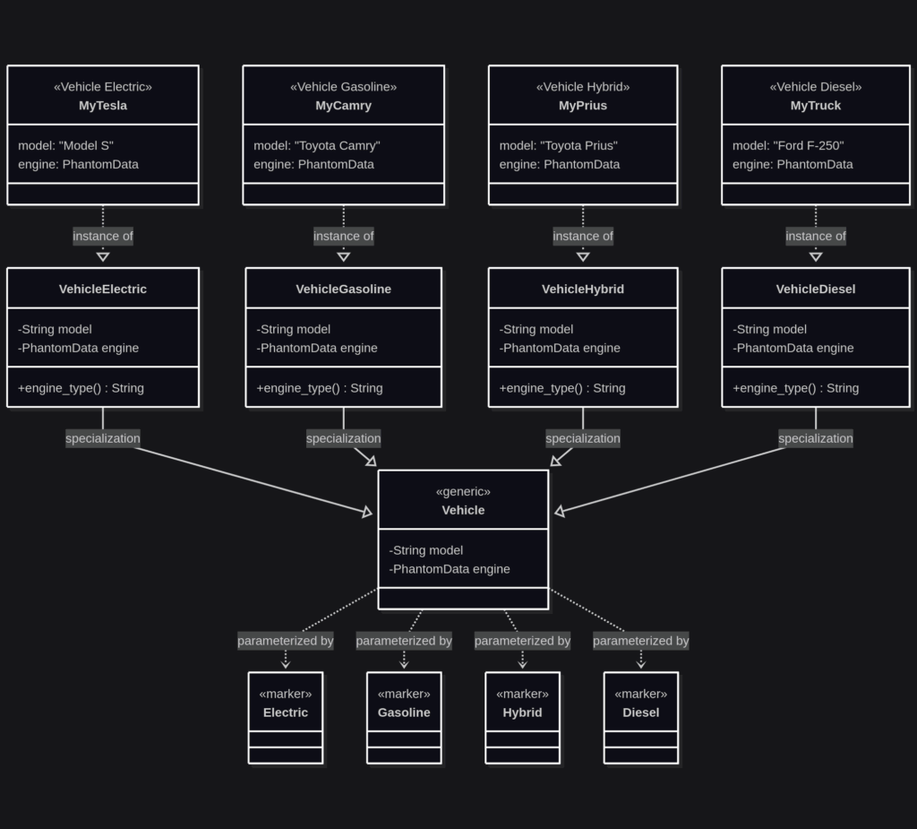 are different concrete types. The compiler knows them apart and won’t let you mix them.fn refuel(vehicle: Vehicle<Gasoline>) { /* ... */ } let tesla = Vehicle::<Electric> { /*...*/ }; refuel(tesla); // ❌ compile error: wrong type