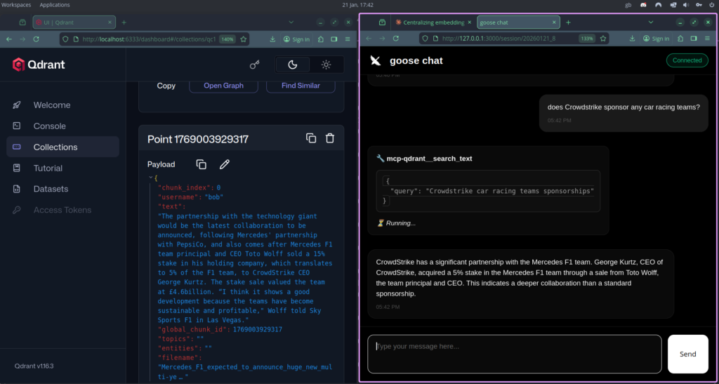 With recent data that you have gathered and “upserted” to Qdrant, the LLM can use its MCP to access your local, current/recent data instead of stale/irrelevant data from back in the days when the LLM was trained.